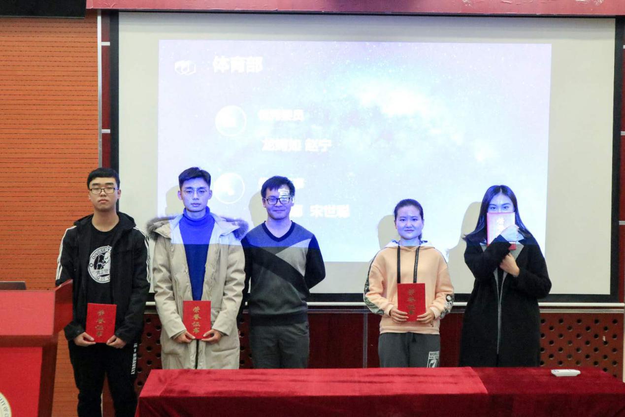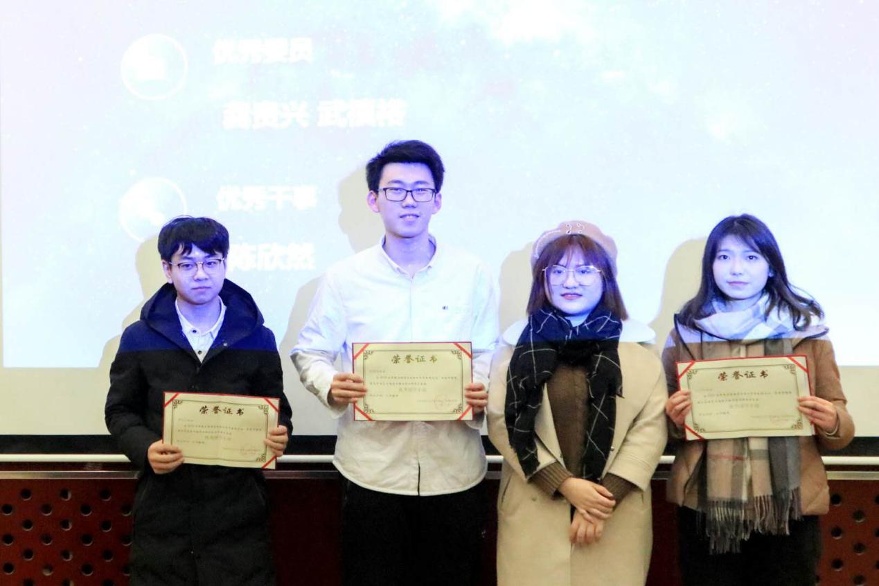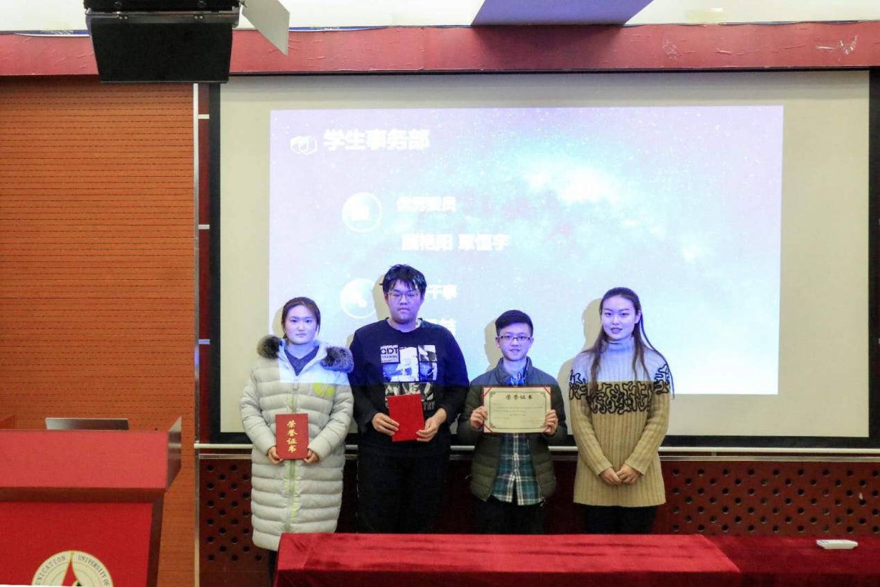 各部门发言结束后,主席胡文睿对这个学期分团委员工会的优秀委员及优秀干事名单进行了宣读。之后各部门部长对其部门获奖人员颁发证书并合影留念。
