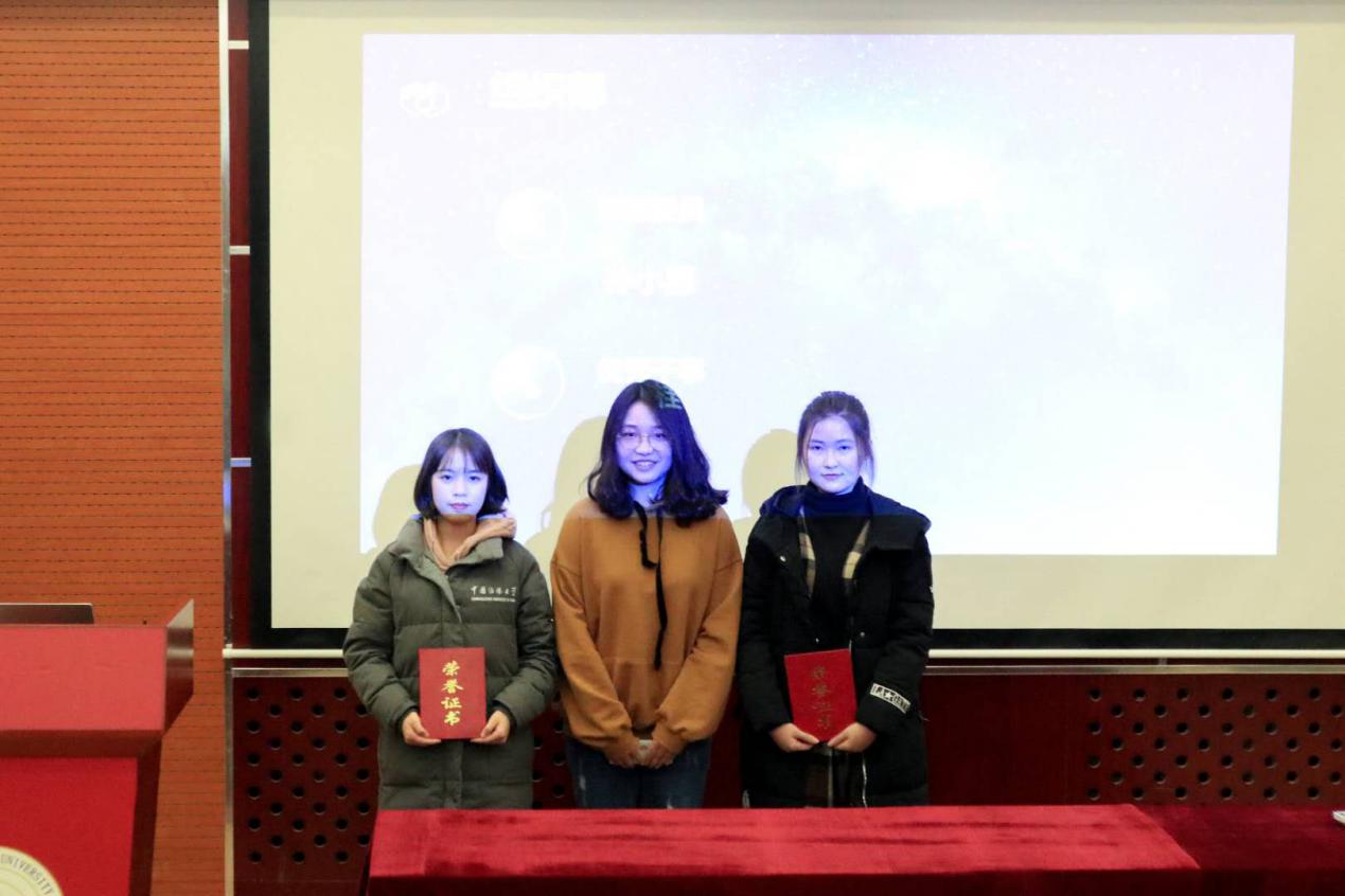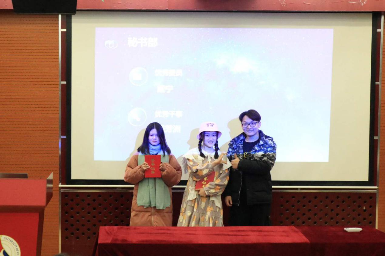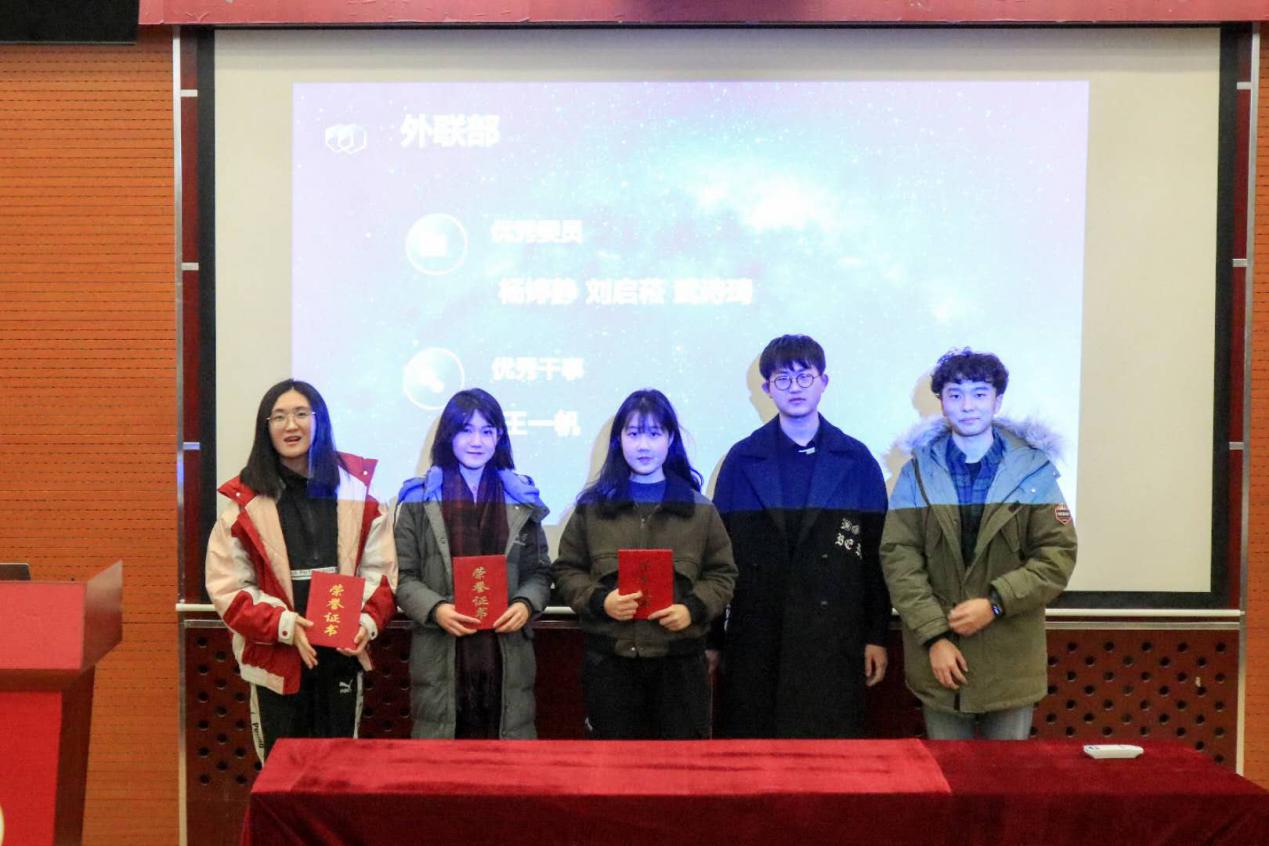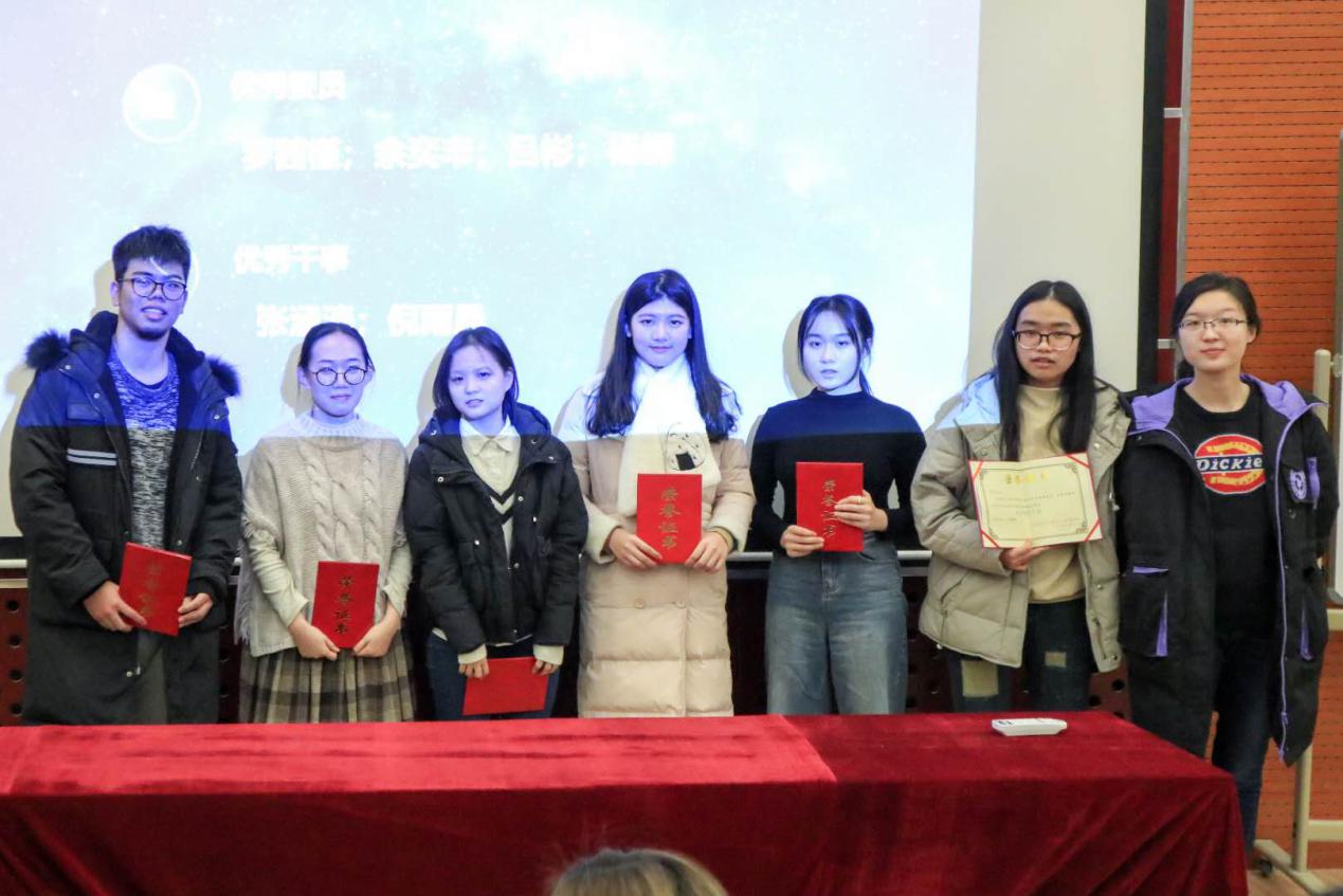 各部门发言结束后,主席胡文睿对这个学期分团委员工会的优秀委员及优秀干事名单进行了宣读。之后各部门部长对其部门获奖人员颁发证书并合影留念。