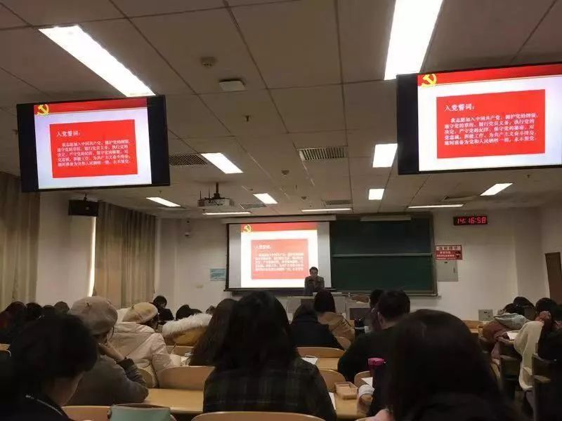 老师向同学们详细介绍了从入党积极分子到正式党员的全部流程,同时强调入党要严格遵循流程,向同学们介绍了几个由于个人疏忽最终没有成功加入中国共产党的例子,让同学们引以为戒。
