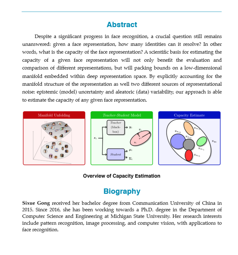 主讲人简介:Sixue Gong received her bachelor degree from Communication University of China in 2015. Since 2016, she has been working towards a Ph.D. degree in the Department of Computer Science and Engineering at Michigan State University. Her research interests include pattern recognition, image processing, and computer vision, with applications to face recognition.