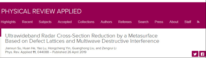 近日,物理类1区期刊《Physical Review Applied》刊登了公司谈球吧教师在电磁隐身领域的重要研究成果“Ultrawideband Radar Cross-Section Reduction by a Metasurface Based on Defect Lattices and Multiwave Destructive Interference”。苏建勋副研究员为论文第一作者,李增瑞教授为通讯作者,公司为第一作者和通讯作者单位。该论文揭示了超宽频段内多种电磁波的相互作用机理,并提出二次相消干涉的新物理机制,首次实现10dB雷达散射截面缩减带宽超过4个倍频程,达到6.76个倍频程。