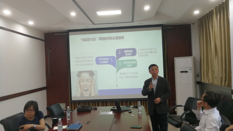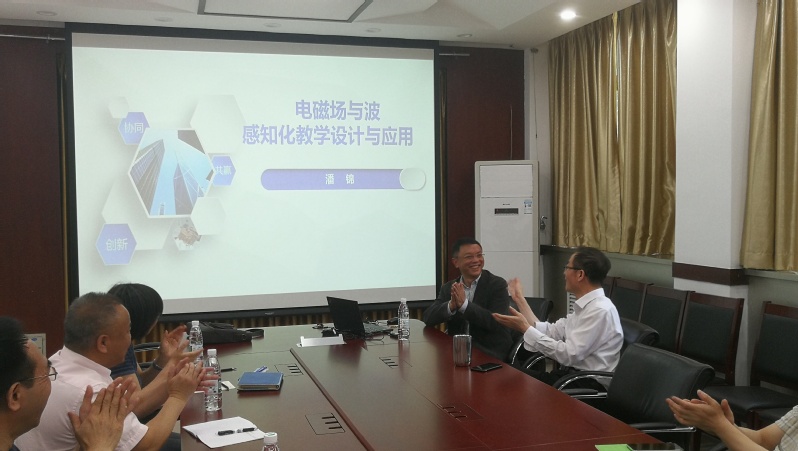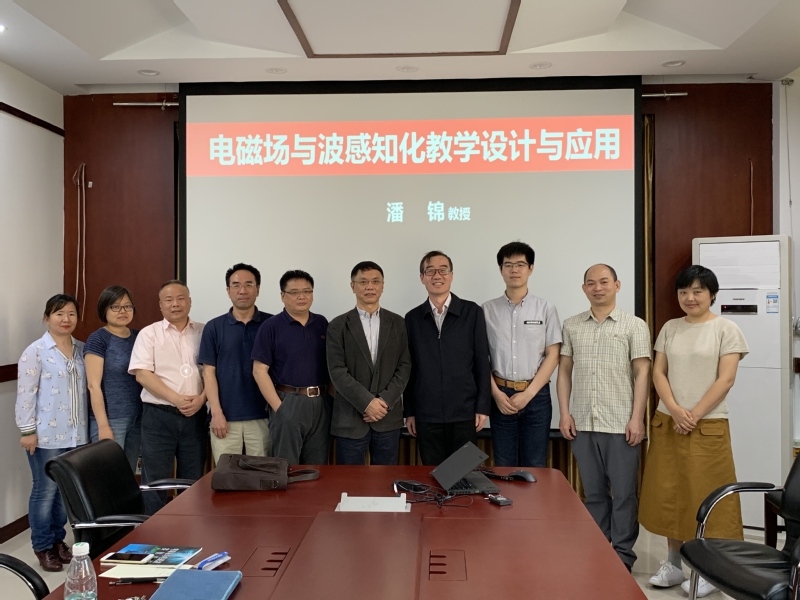 此次报告的题目为《电磁场与波——感知化教学设计与应用》,主要介绍了本科生必修课程《电磁场与电磁波》的教学方法。潘教授提出,电磁场的教学中应“去数学化”,转而强调物理概念。在传统电磁场的教学方法中,我们把原本就很抽象的自然存在——场,又用更抽象的数学概念表示出来,这会给员工造成极大地困惑。因此,在教学过程中,应让数学当配角、物理当主角。为了降低教学难度,我们要尽量“把矢量变为标量,把高维变为一维,把算符变为代数”,而要实现这一目的,就要借助于分离变量的方法。潘教授还指出,电磁场这门课中包含约300个知识点,我们不应该把这些知识点“均匀平铺”,而是要抓住主要矛盾,在教学中分清楚“轻重缓急”,这样才能给员工以层次感,让员工知道哪些是重点、哪些是难点。参加报告的众位教师与潘教授进行了深入地讨论且广泛交换了意见,并在会后合影留念。
