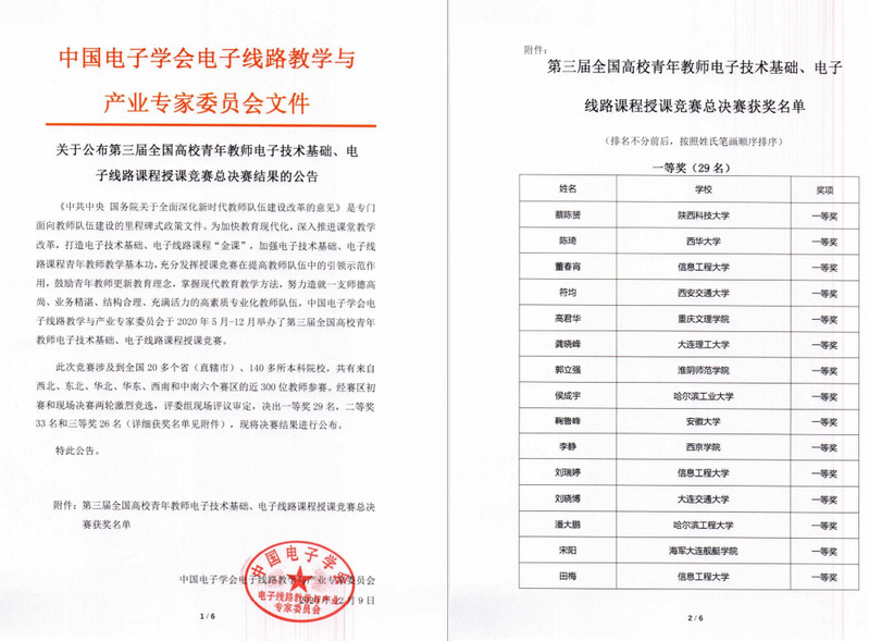 12月7日,公司谈球吧教师李彬在第三届全国高校青年教师电子技术基础、电子线路课程授课竞赛总决赛中荣获二等奖。本次比赛暨全国高校青年教师电子技术基础、电子线路课程授课教学研讨会,由中国电子学会电子线路教学与产业专家委员会、全国高等公司电子技术研究会主办。