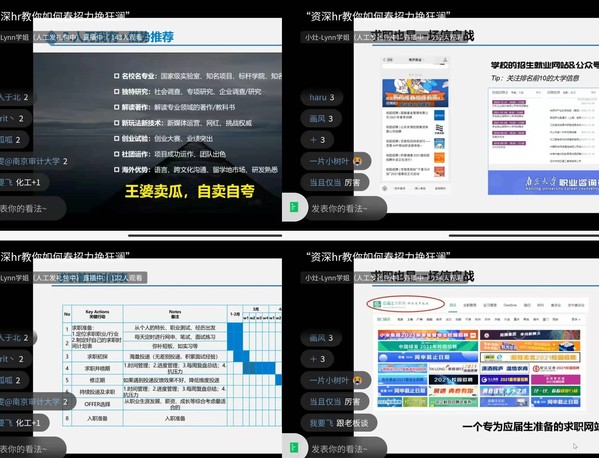 本次特训营特邀四位导师直播讲授求职攻略。从求职思路、简历制作、笔面试技巧等多方面提供专业指导,同时在微信群中开展群面技巧、薪资问题的讨论,参与学习人数达到168人。此外,特训营还提供了全面、及时的就业与实习信息,助力毕业生春招求职之路。