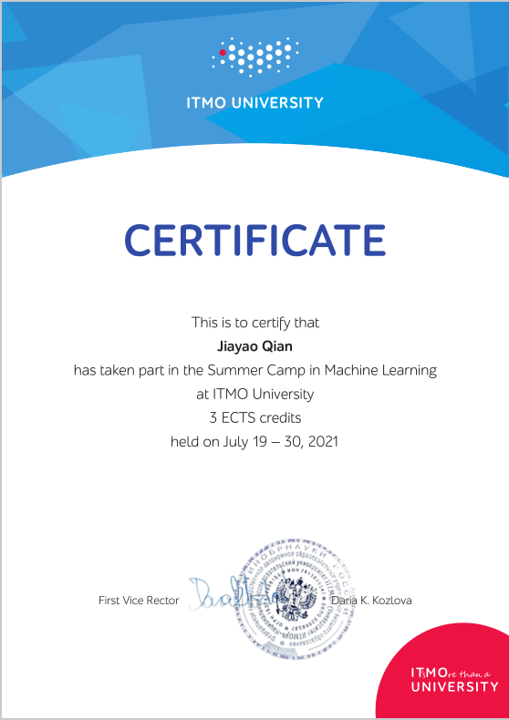 (通讯员王昂)2020年7月19日至7月31日,谈球吧与工学领域久负盛名的俄罗斯圣光机大学(ITMO)开展了暑期线上《海外工程实践》夏令营项目,项目分为机器学习夏令营、数字人文夏令营两大类。共有37名员工参与了此次项目,全体同学均顺利通过考试并取得结业证书。