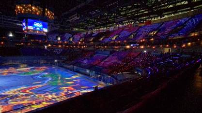 内容创作团队充分发挥公司的专业优势,摸索出低分辨率像素风格的场馆观众席动画创作规律,自主设计了一套创作流程。依托“体育互动展示沉浸式虚拟预演系统”,配合冬奥场馆媒体展示要求,为国家体育馆和五棵松体育馆两个冬奥冰球场馆创作“欢乐熊猫”、“现场倒计时”、“冰球图标”、“聚光灯熊猫”、“城市动画”、“宇宙聚焦”“烟花效果”等主题动画16个,效果动画6个,配合动画9个,此外还设计了24个参赛国家的入场动画。