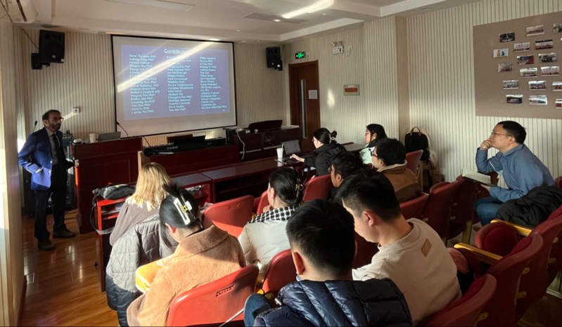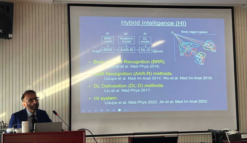 此次报告的主题是“医学图像分析中的混合智能”,Udupa教授将深度学习技术在图像分析领域中引发的变革作为切入点,对医学图像分析任务的独特性和自然智能与人工智能的混合应用进行了介绍。报告首先阐释了人类专家在医学专业方面经验积累的重要意义,即自然智能在整体理解和物体识别上比人工智能表现出色,而人工智能更擅长于把握局部细节。随后Udupa教授对结合自然智能和人工智能的合理方法进行了介绍,通过针对数据和基准定义进行规范,充分利用自然智能和人工智能的互补优势,为医学图像创造混合智能方法。最后,Udupa教授展示了两个应用案例,针对儿童限制性呼吸道疾病和肿瘤患者的放射治疗规划问题,对混合智能方法在图像分割领域中的应用进行了演示。现场参会师生与Udupa教授针对报告中的先进思想进行了充分的问答讨论,会后Udupa教授还对科学研究方法论和医学影像方向的发展趋势进行了展望。