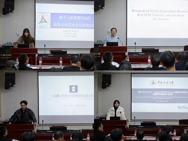 随后,谈球吧的四位优秀专业硕士研究生曹文琪同学、郭佳琪同学、田镓豪同学和张星宇同学分别作了题为“基于人脸表情识别的数字文化艺术交互系统实现”、“Research on Poetry Generation Based on Bi-LSTM Networks and Attention Mechanism”、“VR环境下的博物馆漫游”、“基于WinForm 、OpenCV 和 SQL Server 的数字仪器识别与管理系统的设计与实现”的主题汇报,并结合他们的科研学习及实践经历和参会师生进行了交流与分享。