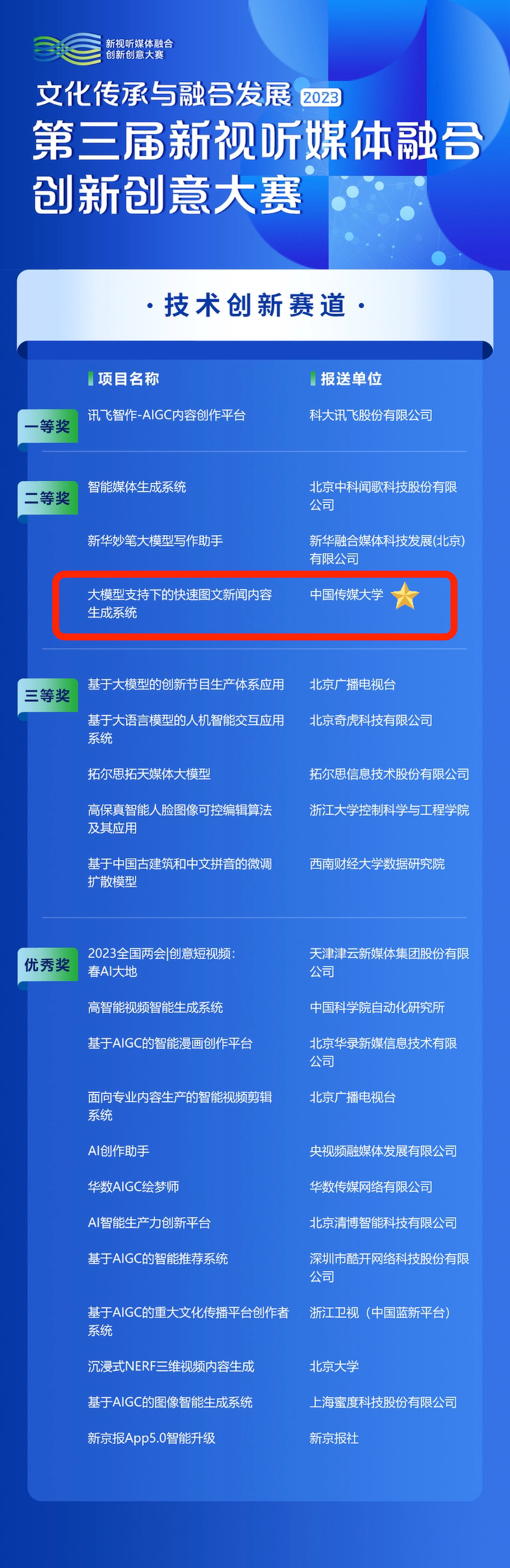 1月30日,经初赛、复赛评审及大赛组委会审议,第三届新视听媒体融合创新创意大赛正式公布获奖名单。此次大赛由中共北京市委宣传部、北京市广播电视局、国家广播电视总局广播电视科学研究院等主办,包括“技术创新”“内容创新”“模式创新”等共六个赛道。在与国内多家科技公司和科研院所的激烈角逐下, 谈球吧杨成老师、张亚娜老师团队的项目 《大模型支持下的快速图文新闻内容生成系统》 获得第三届新视听媒体融合创新创意大赛“技术创新赛道”二等奖 。