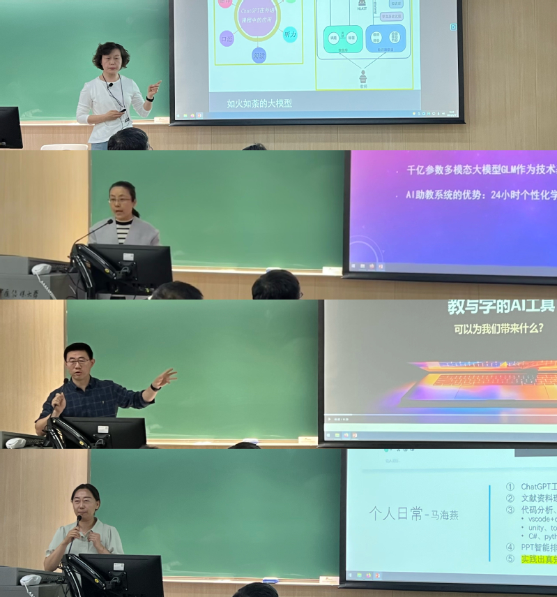 接下来,通信工程系张莉副教授、数字媒体技术系于瀛副教授、演艺工程技术系主任蒋玉暕教授、实验教学中心马海燕老师作为大会发言人分别以《面对AI,我的“危机感”》 《顶尖学府布局“人工智能+教育”》 《教与学的AI工具》 《AI在教学中的应用》为题进行了经验分享,就如何推进信息技术与让人工智能充分发挥其在教学中的作用,AI助教如何有效地整合到课堂教学中等问题分享了自己的思考与探索。