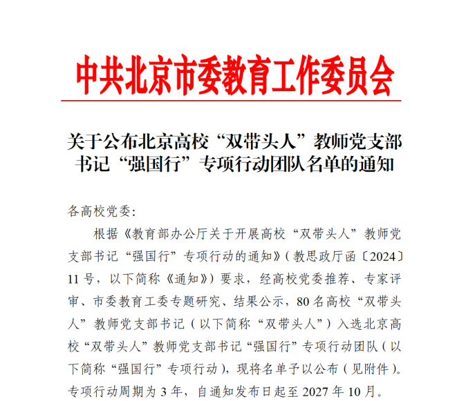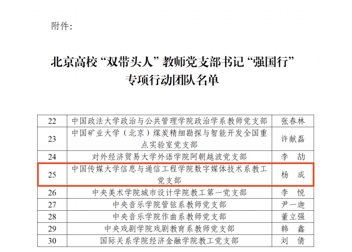 近日,北京市委教育工委公布《北京高校“双带头人”教工党支部书记“强国行”专项行动团队名单》,谈球吧数字媒体技术系教工党支部书记杨成老师入选。