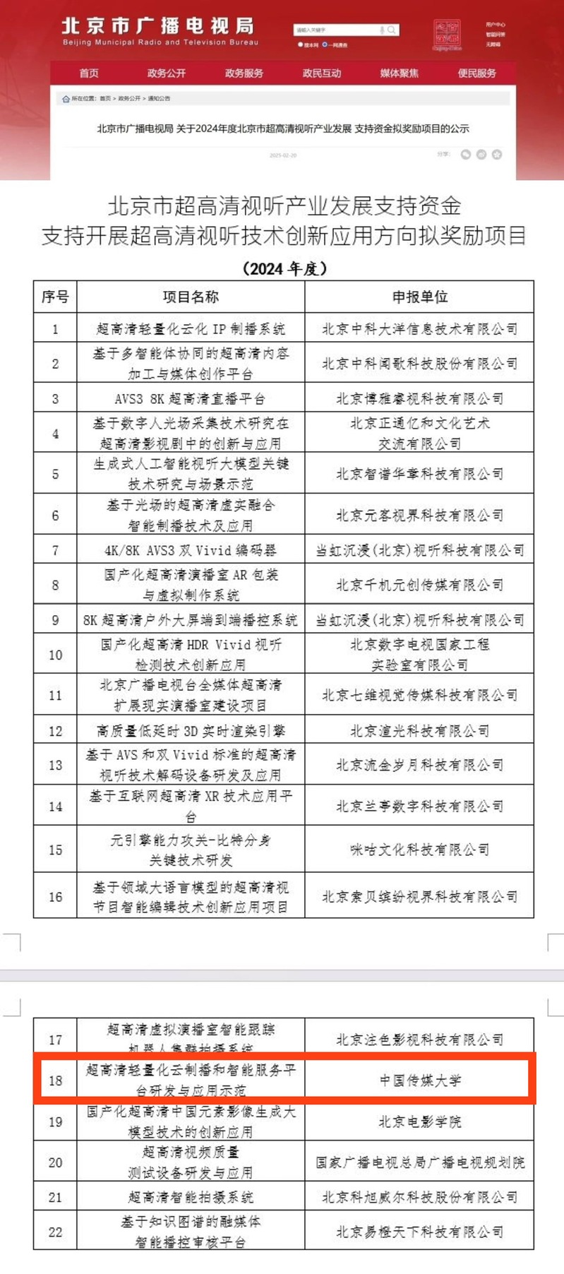 近日,谈球吧网页版登录入口《超高清轻量化云制播和智能服务平台研发与应用示范》项目获评 “2024年度北京市超高清视听产业发展支持资金奖励项目”,并与北京市广播电视局签订了该奖励项目(超高清视听技术创新应用方向)协议书。
