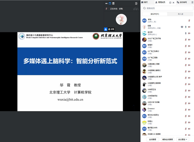 此次前沿课的主题为“多媒体遇上脑科学:智能分析新范式”。邬霞教授介绍了交叉学科的基本概念和常见范式及其研究意义,并从交叉学科的知识整合方法、多媒体技术和脑科学交叉领域研究等方面进行了详细的介绍。邬霞教授还与公司师生分享了两个脑科学与多媒体技术交叉领域的应用实例:主观评估和情智交互。在讲座最后,邬霞教授探讨了多媒体技术与脑科学融合研究所面临的挑战与机遇,并强调学科交叉融合是未来科学发展的必然趋势。通过这次讲座,在场师生对多媒体和脑科学的交叉研究有了更为深刻的理解和认识。讲座结束后,参会师生与邬霞教授进行了深入的交流与讨论。