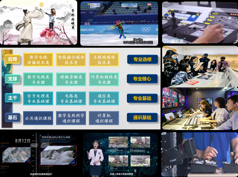 课程体系以数学、物理、计算机技术为“基石”,信号与系统、数字信号处理、通信原理等电子信息类课程为“主干”,现代电视原理、数字视音频处理、计算机网络、机器学习等为“ 支撑 ”,配合数字演播技术、融合媒体系统设计与应用、媒体大数据处理、智能媒体分析与处理等丰富多样的专业选修课,从硬件、软件、网络与视音频技术专业知识全方位构建现代视听技术体系。